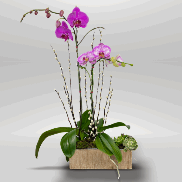 #107 Este elegante arreglo destaca por la armoniosa combinación de orquídeas Phalaenopsis en tonos fucsia y rosado, cuidadosamente dispuestas sobre una base de cerámica con acabado metalizado. Los tallos de Pussy Willow aportan profundidad y altura, realzando la intensidad de los colores y las suculentas le dan un aire sofisticado y natural a la composición. Perfecto para iluminar cualquier espacio con un toque vibrante y contemporáneo.