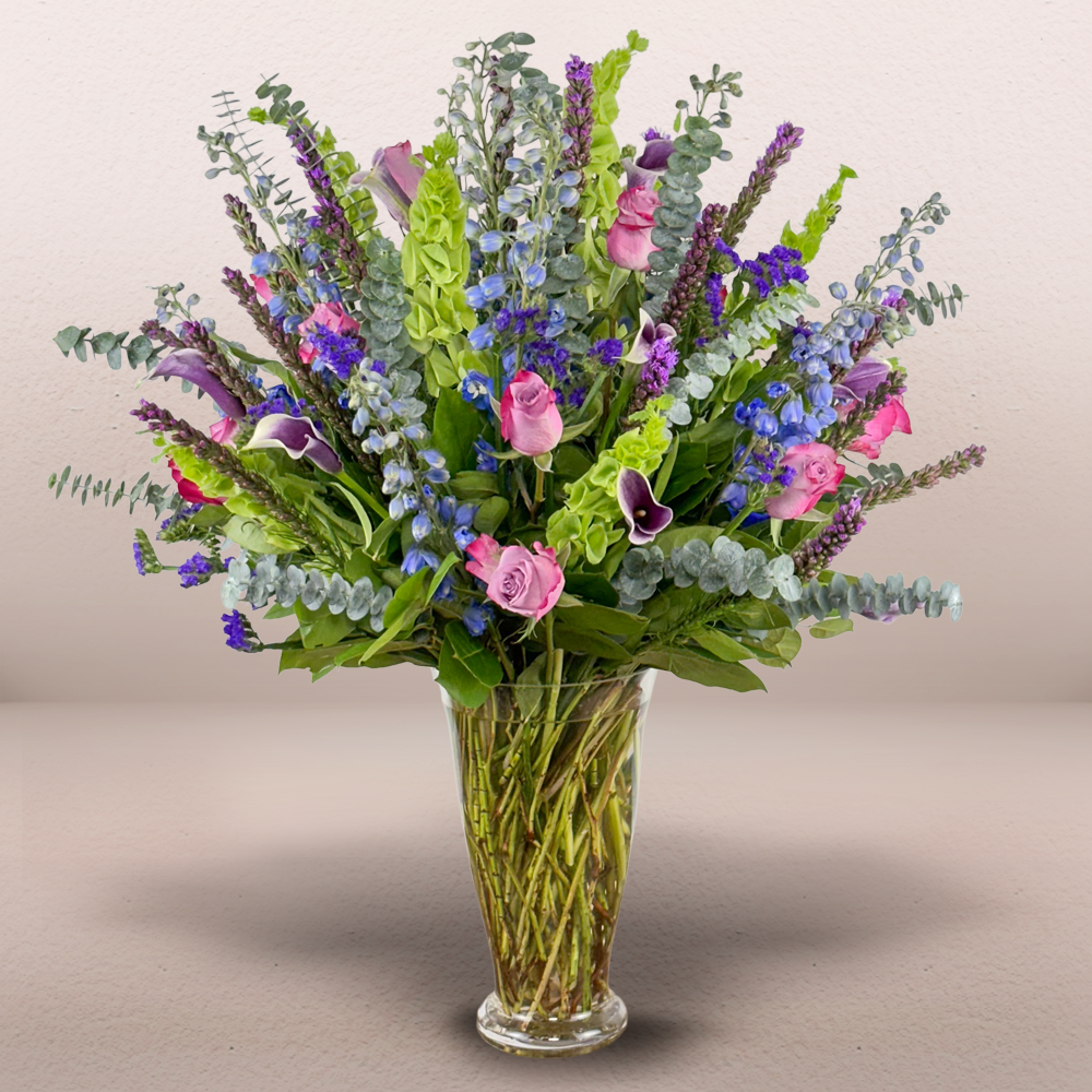 #524 Una composición de rosas, delphinium y liatris, combinadas con follajes frescos en un diseño de estilo natural y lleno de movimiento. Un arreglo que transmite libertad, admiración y un amor auténtico que siempre deja huella.