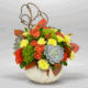 #185 Inspirada en la generosidad del otoño, esta cornucopia celebra la abundancia en su máxima expresión. Gerberas en tonos terracota, tulipanes amarillos y mini rosas orange se unen en un armonioso juego de color, acompañadas de follajes de temporada que aportan textura y encanto natural. Cada flor parece rendir homenaje a la temporada de cosecha, evocando calidez, gratitud y belleza en cada detalle. Perfecta para llenar de vida y color cualquier espacio durante esta época dorada del año.