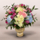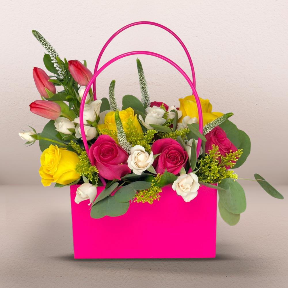 #525 Una mezcla vibrante de rosas, tulipanes y flores frescas en tonos llenos de vida, presentada en una base moderna que destaca por su color. Un diseño alegre y espontáneo que transmite cariño, cercanía y ese amor que siempre sabe cómo sorprender.