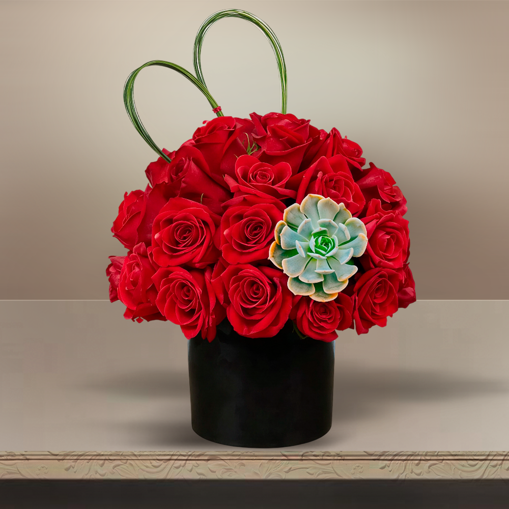 Una declaración intensa y sofisticada. Este arreglo reúne 3 docenas y media de rosas rojas y un delicado toque de suculenta, creando un contraste vibrante lleno de carácter. El diseño se realza con flexigrás formando un delicado corazón y se presenta en una base negra que aporta elegancia y profundidad. Una pieza impactante, pensada para expresar sentimientos que no pasan desapercibidos