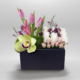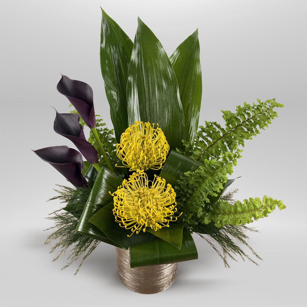#603 Un arreglo moderno, elegante y lleno de personalidad para reconocer a quien siempre lo mantiene todo bajo control. “Gracias con Estilo” combina llamativas calas negras con un toque vibrante de pincushion amarillo, enmarcado por follajes verdes sofisticados y textura natural, todo diseñado en una base premium. Es el detalle perfecto para decir “tu trabajo se nota y se valora” con un diseño diferente y refinado.
