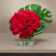 #709 Una composición sofisticada que combina armonía y diseño. Este arreglo reúne una docena de rosas Freedom, tulipanes blancos, cymbidium blanco, liatris y toques de statis violeta, creando un balance delicado entre color, textura y forma. Presentado en una base de cerámica blanca, es una propuesta elegante y contemporánea que destaca por su estilo y buen gusto.