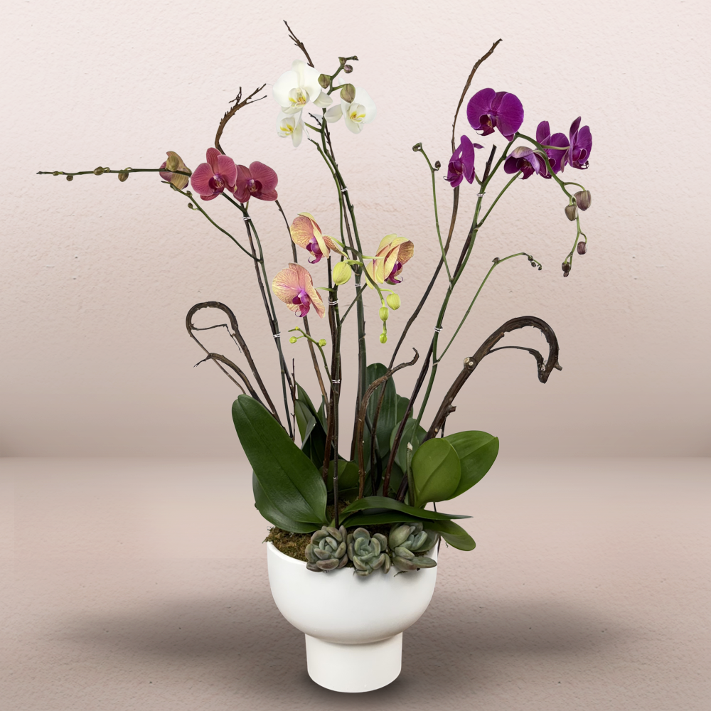 #527 Delicada composición de orquídeas en distintos tonos, diseñada con líneas limpias y un estilo orgánico que resalta su forma y movimiento natural. Acompañada de follajes y detalles sutiles, es una pieza que transmite elegancia, serenidad y una belleza que se impone sin esfuerzo.