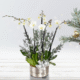#419 Un diseño sofisticado para la temporada festiva que combina la elegancia de la orquídea Phalaenopsis con ruscus tinturado en dorado, creando una silueta vertical moderna y luminosa. La base metálica en tono dorado aporta un toque cálido y refinado, mientras que los pine cones —piñas de pino— y el lazo en cinta roja añaden el acento clásico y tradicional de la Navidad.